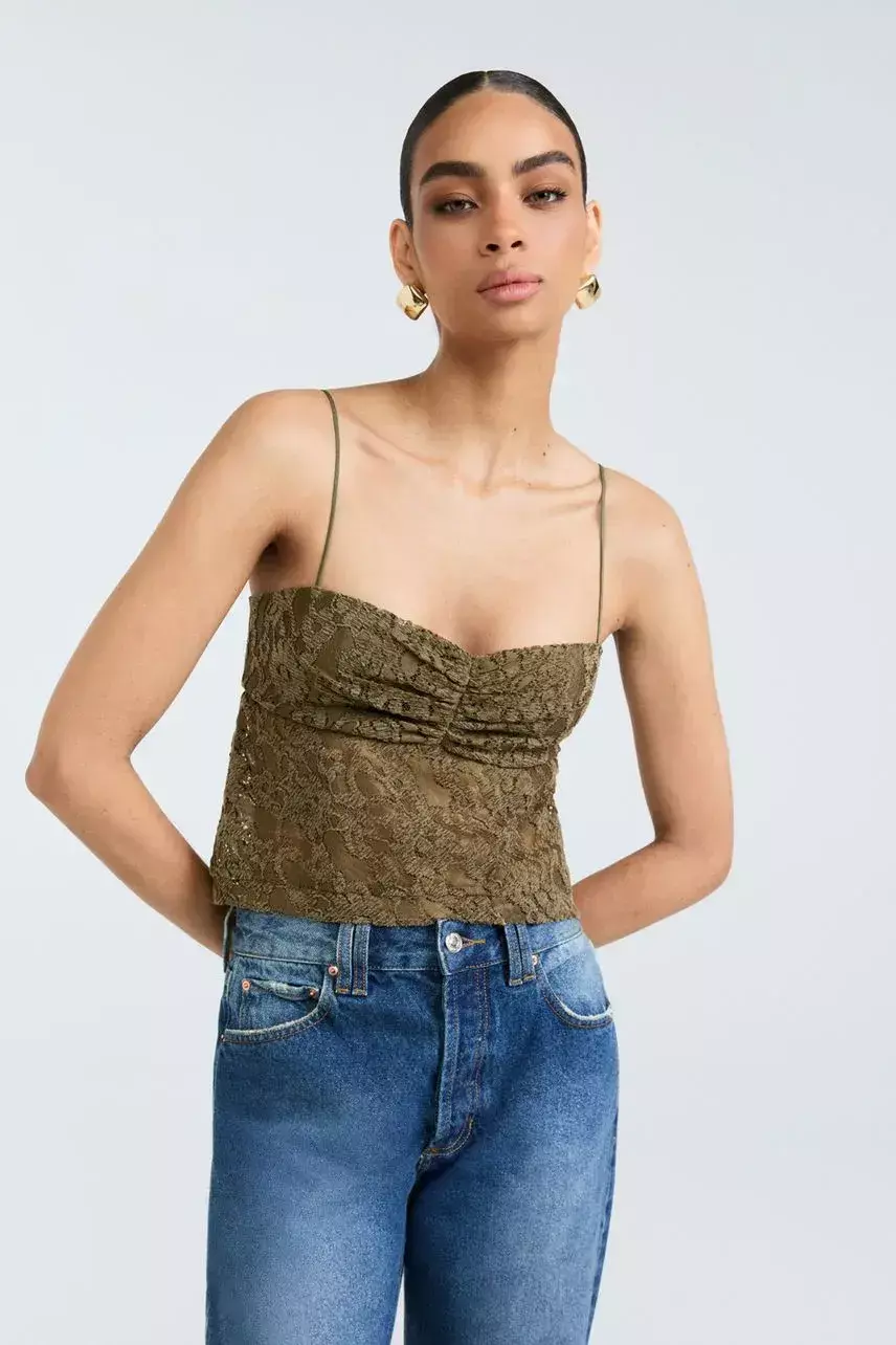 Blusa confeccionada em renda floral jacquard, com modelagem slim e comprimento curto. A peça conta com alças delicadas, decote princesa e detalhe drapeado que valoriza o busto. O fechamento posterior em zíper de metal e o acabamento em barra à fio garantem um toque sofisticado e moderno.