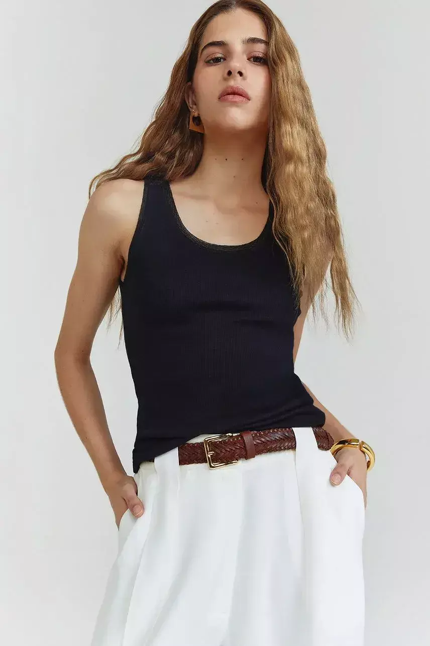 A regata em malha traz modelagem slip ajustada ao corpo e comprimento regular. Com decote U e barra reta, é uma peça versátil e essencial para composições casuais ou em sobreposições sofisticadas.